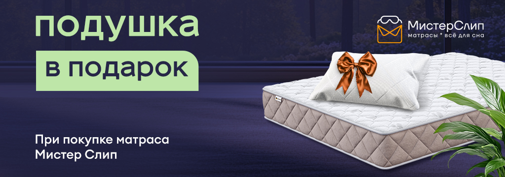 При покупке любого матраса Мистер Слип получите подушку «Молли» в подарок, а за двуспальный – сразу две.