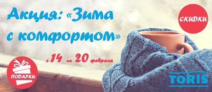 С 6 по 20 февраля действуют скидки до 25%, в том числе на кровати! Проводите зимние дни с комфортом, приобретая мебель для спальни, а также матрасы и аксессуары для сна по выгодным ценам! В дни акции «Зима с комфортом» действуют скидки на продукцию, кроме того, всем покупателям ТОРИС дарит подарки!